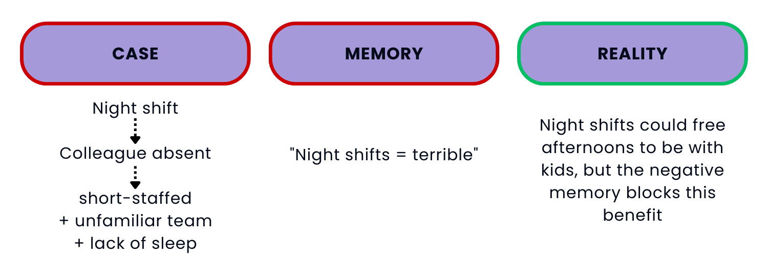 When a nurse has a difficult shift, it can form a lasting negative impression. This negative memory can heavily influence future preferences. They might then strongly avoid that specific shift type, co-worker, or even a particular patient - even if such difficult shifts are rare, or if other patterns offer greater benefits.